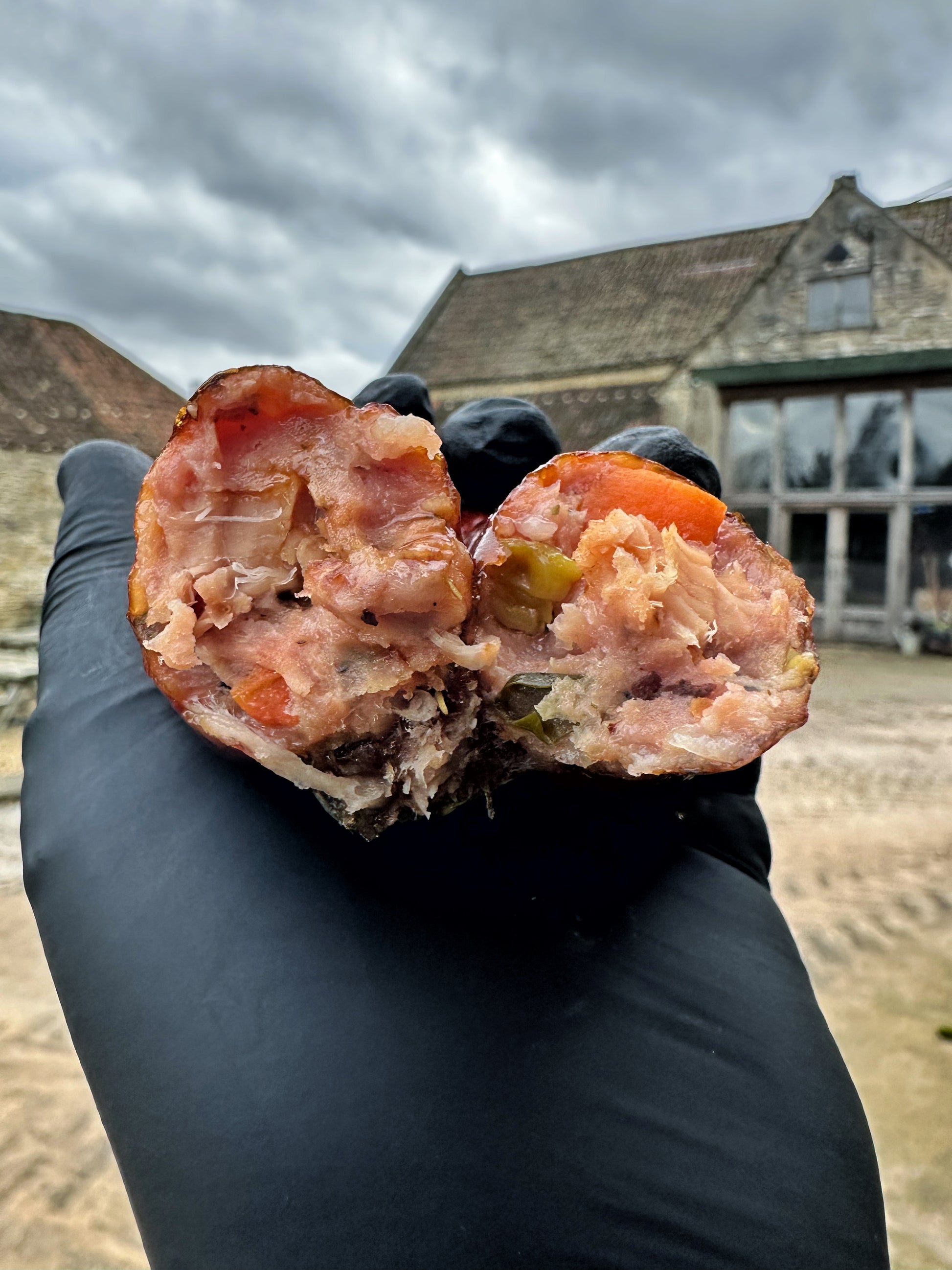 Ingredients: British Pork Shoulder, Oak Smoked Turkey Breast, Ruby Port Soaked Cranberries (SULPHITES), Rosemary, Confit Garlic, Chestnuts, Duck Fat Potatoes, Sea Salt, Marjoram, Milk Powder (MILK), Fire Roasted Carrots, Beef Demi-Glace, Smoked Sprouts, Bread Sauce (GLUTEN), Smoked Pancetta, Onion Powder, Cracked Black Pepper, Thyme, Tomato Puree, Hog Casing, Preservative: E221 (SULPHITES)