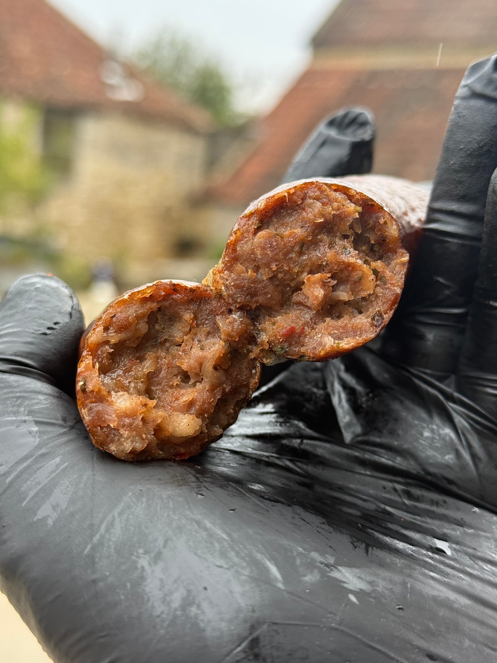 Ingredients: British Pork Shoulder, Pineapple, Old Bay Seasoning (CELERY), Black Pepper, Scotch Bonnet Chilli, White Vinegar, Onion Powder, Garlic, Thyme, Tamari Soy Sauce (SOY), Pineapple Juice, Red Chilli Flakes, Ginger, Honey, Nutmeg, White Pepper, Cinnamon Powder, Spring Onion, Milk Powder (MILK), Preservative - E221 (SULPHITES), Natural Hog Casing